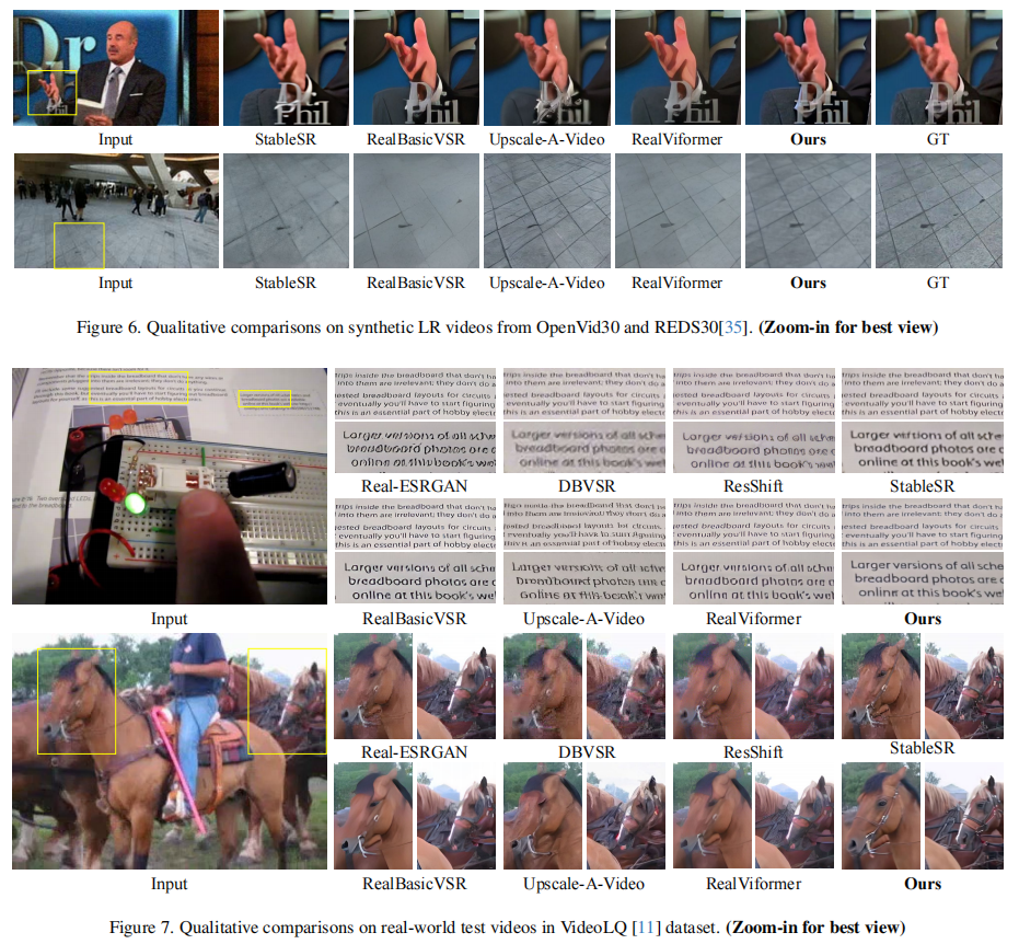 图6 和 图7 展示了在合成和真实视频上的视觉对比。STAR生成的面部纹理、文字结构、动物毛发等细节更加真实,且退化去除更彻底。