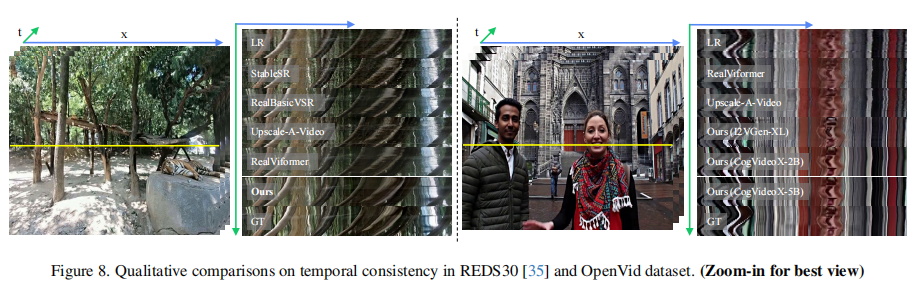 图8 对比了时间一致性。STAR在无光流引导的情况下,仍能保持极佳的帧间连贯性,而StableSR等图像超分方法则出现明显抖动。