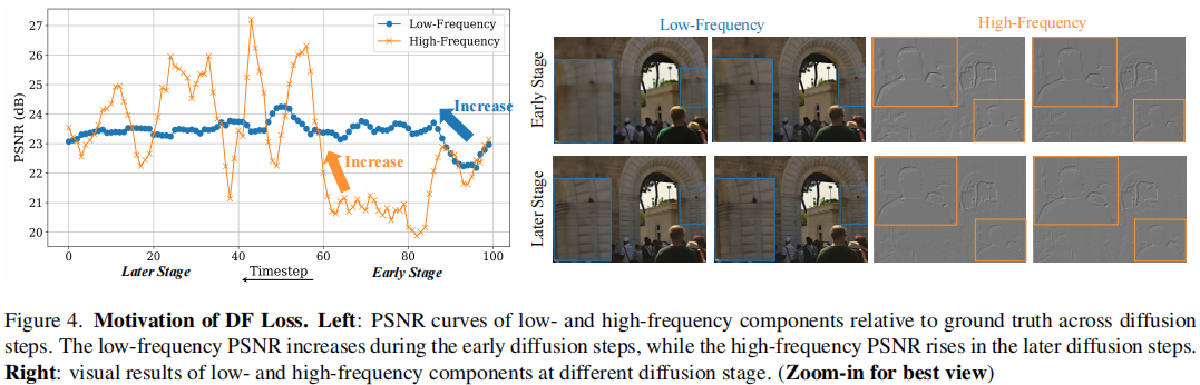 如 图4(左) 所示,低频PSNR在早期快速上升,而高频PSNR在后期才显著提升。图4(右) 的可视化也印证了这一现象。