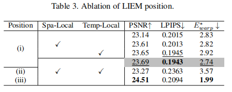 在空间和时间注意力块上同时添加LIEM效果最佳。插入位置(i)优于(ii)和(iii),说明过强的修改会破坏预训练先验。