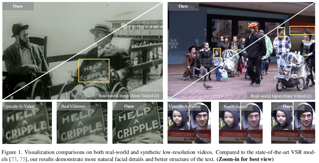 - Real-ESRGAN 和 RealViformer 等GAN或Transformer-based方法虽然能提升分辨率,但存在明显的过度平滑问题,面部纹理模糊,文字边缘不清晰。