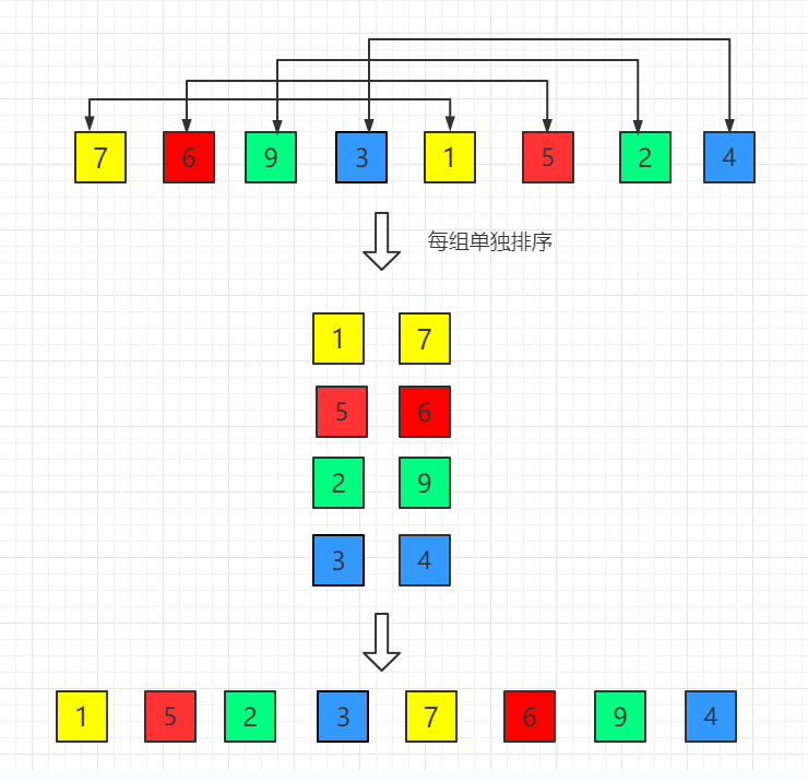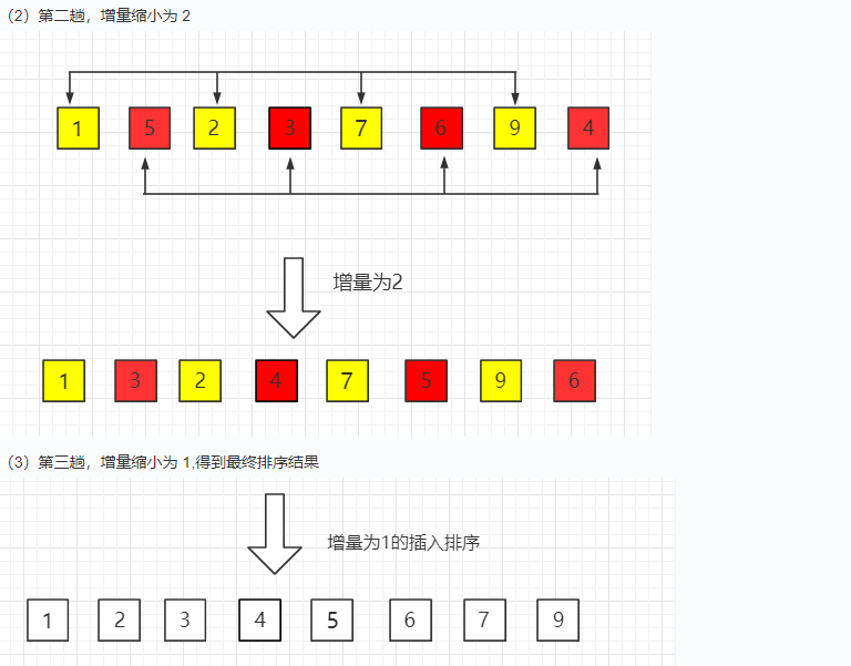public static void main(String[] args) {int[] array = {31,432,1,53,75,36,21,26,622,66,71 57};int gap = array.length;// 确定组数while(gap > 1) { // 当gap为1时,说明已经排序好了for(int i = gap; i < array.length; i++) {int j = i - gap;//分组while(j >= 0) {int tmp = array[i]if(array[i] < array[j]) { //交换array[j + gap] = array[j];array[j] = tmp;j -= gap;}else {break;//如果j+1元素比j大,说明j前面的元素已经都是有序的了}}}}}