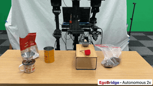 EgoBridge效果展示3:机器人拿起一勺装满咖啡豆的勺子,将其倒入随机放置的目标容器中