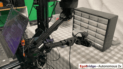 EgoBridge效果展示1:机器人拿起一个玩具,将其放入打开的抽屉中,然后将其关闭