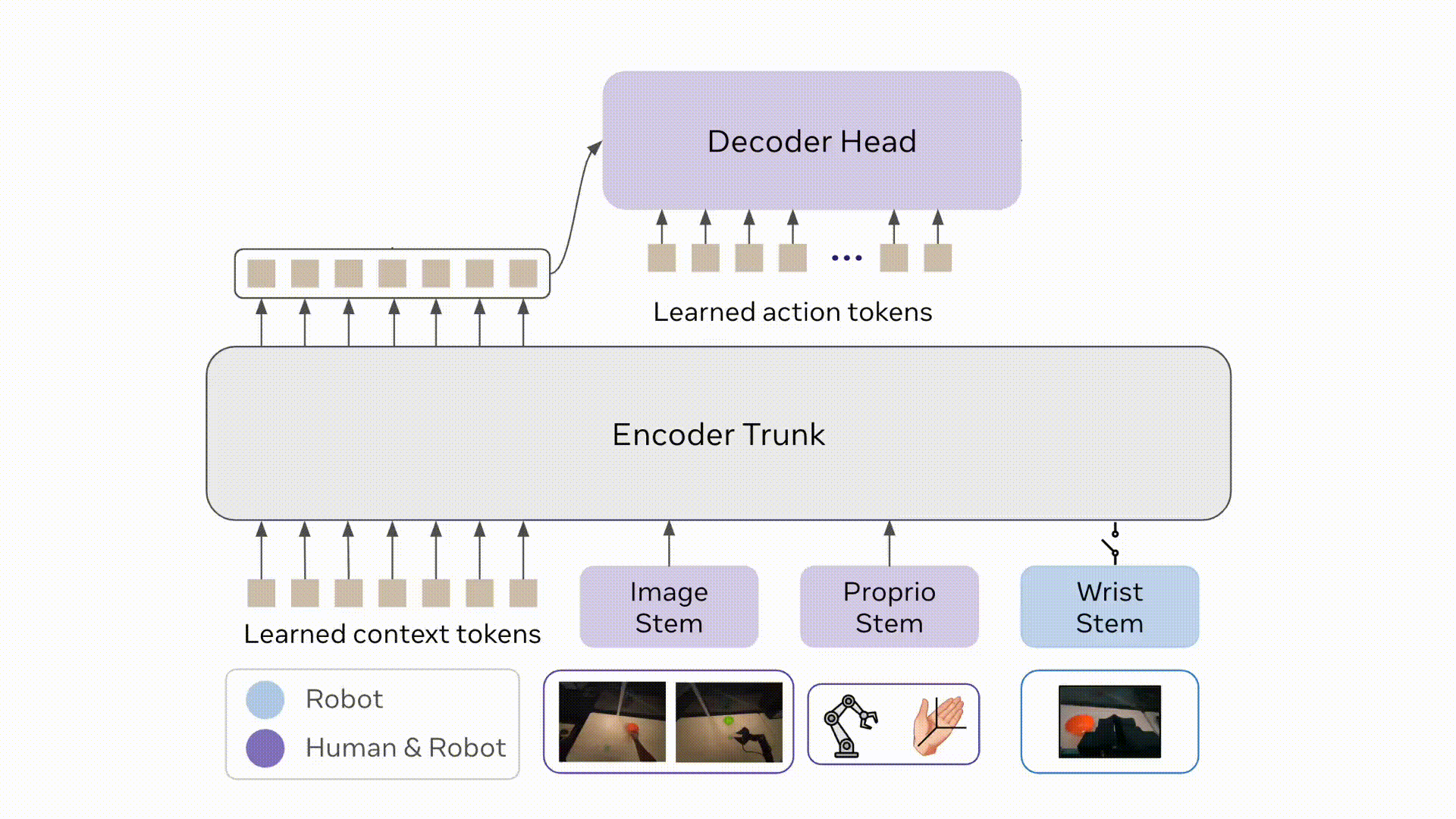 ○ 处理:将末端执行器位姿序列整理为“轨迹块”动作,对关节数据、动作做归一化,统一与人类数据的动作空间
