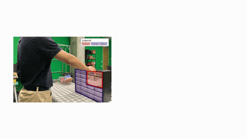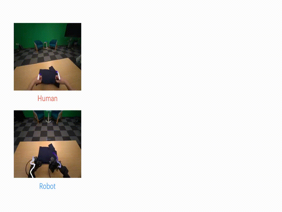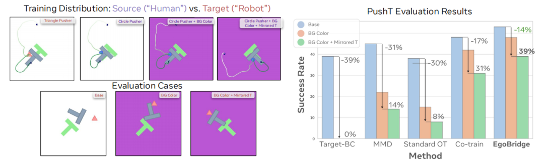 ■ 数据设置:机器人数据仅覆盖“白色背景+正常T形”场景,人类数据额外覆盖“紫色背景+镜像T形”等未被机器人观测的场景。