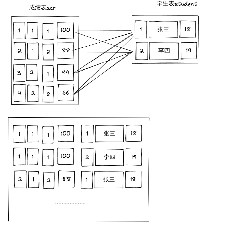 SELECT * FROM scrJOIN studentON scr.stu_id = student.idJOIN sub ON scr.sub_id = sub.id;// 查询 语文 成绩中大于 80 的学生姓名
