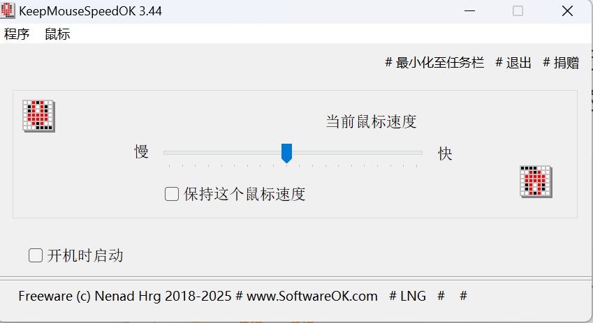 软件介绍 KeepMouseSpeedOK是一款专业鼠标速度调节工具,这款软件由SoftwareOK开发的,软件大小仅100KB,也是非常小。 软件使用 功能就更简单了,只有调节速度这一功能,调节后可以勾选“保持这个鼠标速度”,那么不管你系统怎么更新,鼠标的快慢都按你的设置来调节,不会因为更新还改变鼠标的反应速度! 软件下载 UC 迅雷 夸克