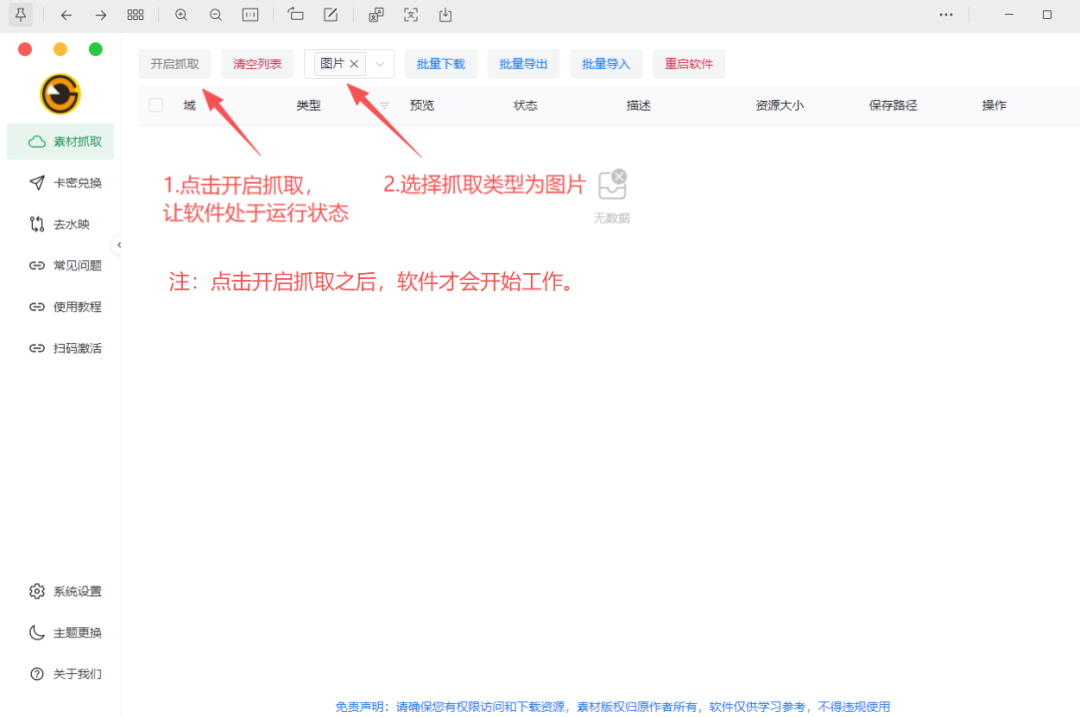 1️⃣ 选择抓取类型,比如图片,设置好类型后,点击左上角的开始抓取