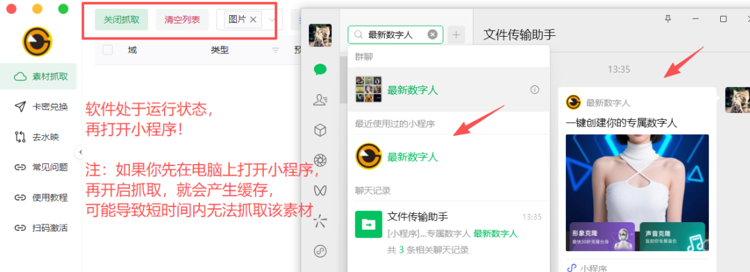 小贴士:抓取过的素材请先保存,删除后短期内无法重复抓取(如果不小心把素材删除了,可以清理微信缓存,或者换个微信号重新登入抓取)