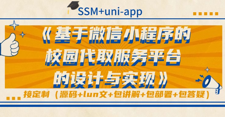 本系统基于微信小程序生态,采用SSM(Spring、SpringMVC、MyBatis)作为后端开发框架,结合uni-app跨平台前端技术与MySQL数据库,实现前后端分离的系统架构。平台主要面向在校学生,提供快递代取、物品代送、任务发布与接单、评价等核心功能,实现代取服务的线上化、规范化与流程化管理。