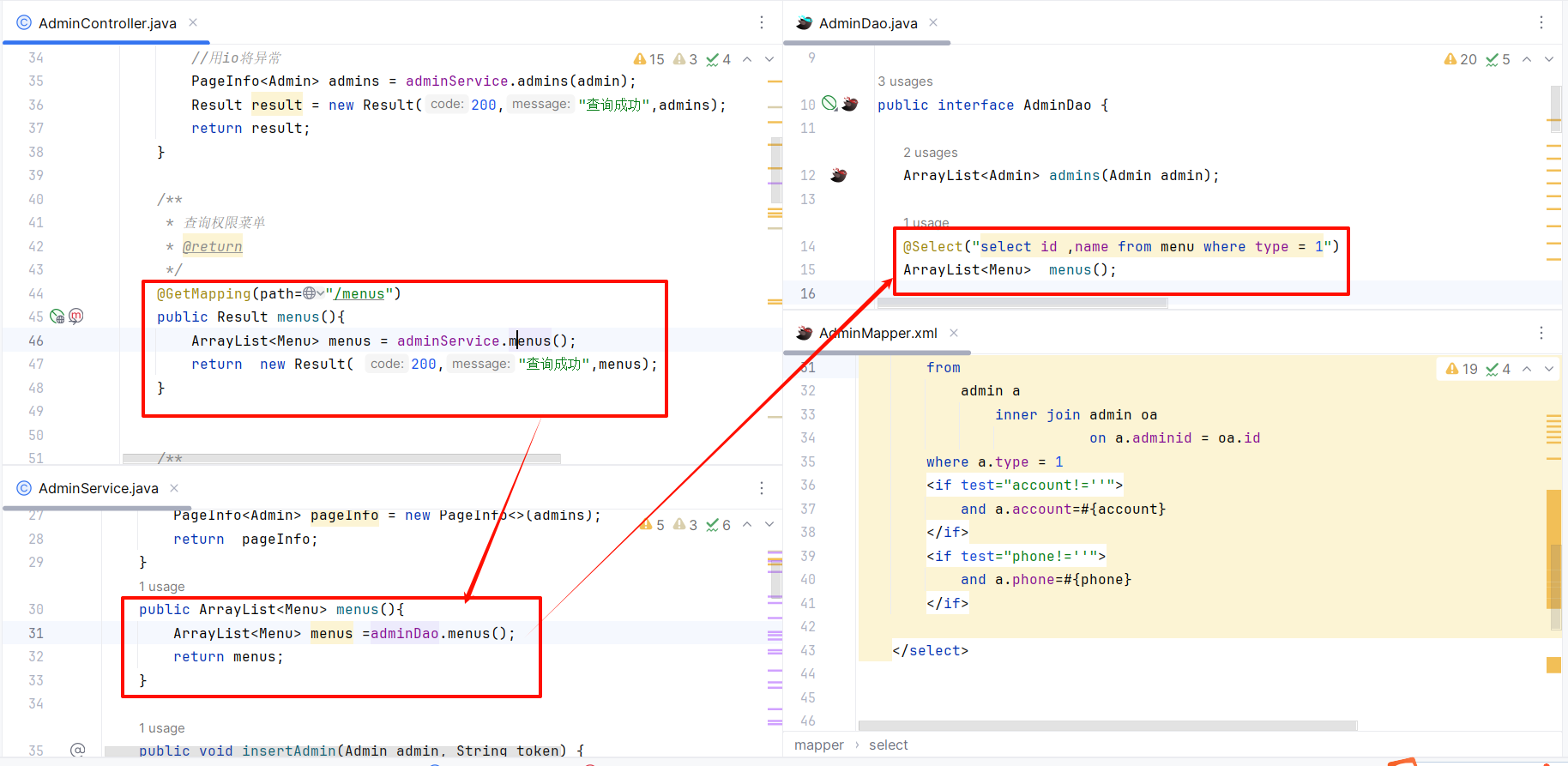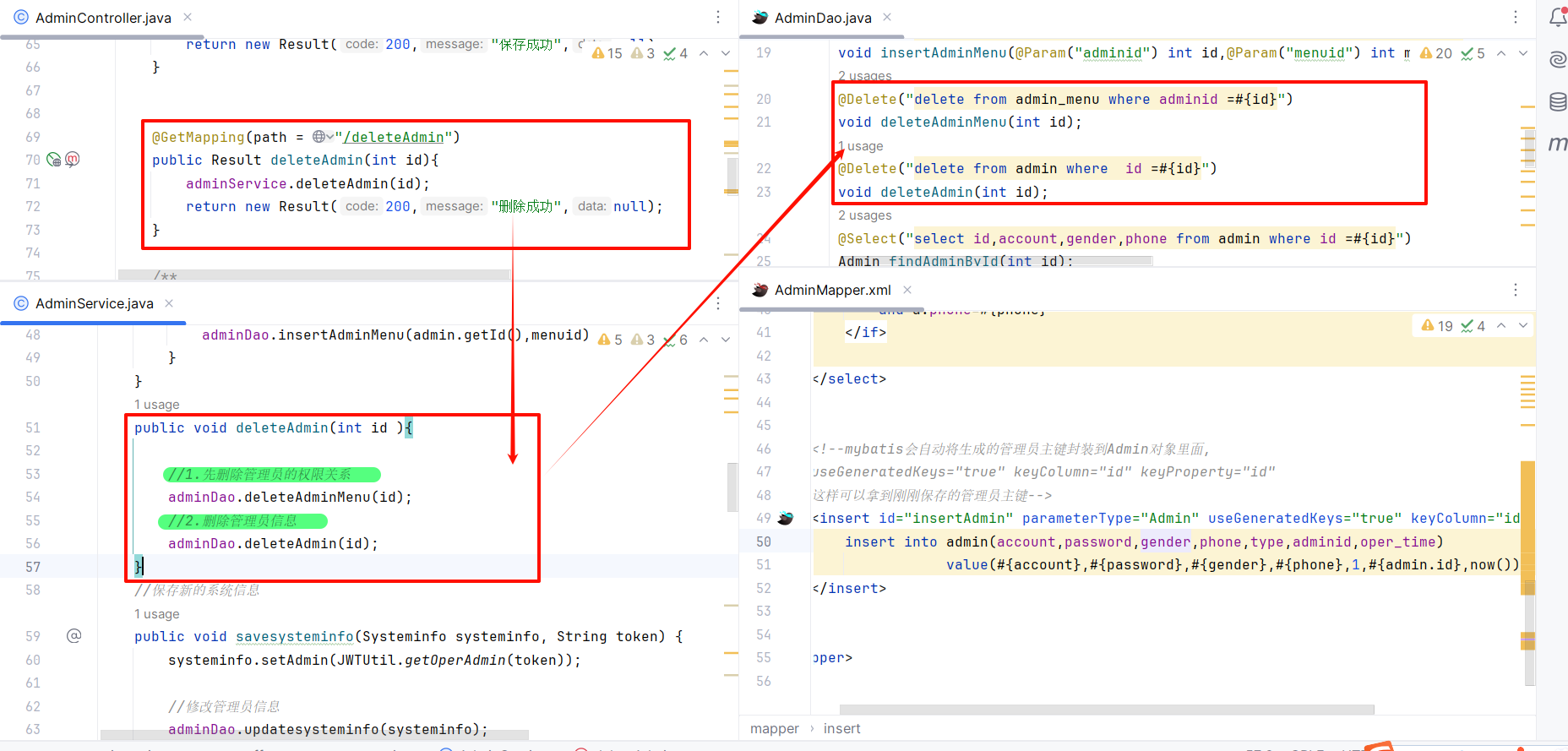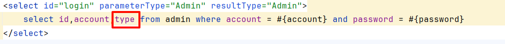 <resultMap id="adminMap" type="Admin"><id column="id" property="id"></id><result column="account" property="account"></result><result column="gender" property="gender"></result><result column="phone" property="phone"></result><result column="type" property="type"></result><result column="oper_time" property="operTime"></result><!--封装操作人对象数据--><association property="admin" javaType="Admin"><result column="oper_account" property="account"></result></association></resultMap><select id="admins" parameterType="Admin" resultMap="adminMap">selecta.id,a.account,a.gender,a.phone,a.type,oa.account oper_account,a.oper_timefromadmin ainner join admin oaon a.adminid = oa.idwhere a.type = 1<if test="account!=''">and a.account=#{account}</if><if test="phone!=''">and a.phone=#{phone}</if></select>