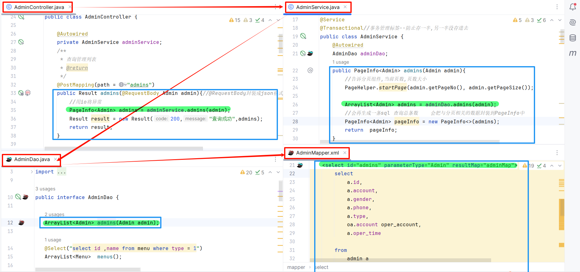 public PageInfo<Admin> admins(Admin admin){//告诉分页组件,当前页数,页数大小,会自动算出开始位置,并且会在sql后面自动添加limit语句PageHelper.startPage(admin.getPageNo(), admin.getPageSize());ArrayList<Admin> admins = adminDao.admins(admin);//会再生成一条sql 查询总条数 会把与分页相关的数据封装到PageInfo中PageInfo<Admin> pageInfo = new PageInfo<>(admins);return pageInfo;}