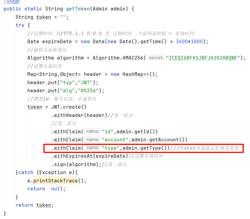public class JWTUtil {/*** 根据用户id,账号生成token* @param admin* @return*/public static String getToken(Admin admin) {String token = "";try {//过期时间 为1970.1.1 0:0:0 至 过期时间 当前的毫秒值 + 有效时间Date expireDate = new Date(new Date().getTime() + 3600*1000);//秘钥及加密算法Algorithm algorithm = Algorithm.HMAC256("ZCEQIUBFKSJBFJH2020BQWE");//设置头部信息Map<String,Object> header = new HashMap<>();header.put("typ","JWT");header.put("alg","HS256");//携带id,账号信息,生成签名token = JWT.create().withHeader(header)//第一部分//第二部分.withClaim("id",admin.getId()).withClaim("account",admin.getAccount()).withClaim("type",admin.getType())//在token里面显示管理员类型.withExpiresAt(expireDate)//设置有效时间.sign(algorithm);//第三部分}catch (Exception e){e.printStackTrace();return null;}return token;}public static String getUserToken(User user) {String token = "";try {//过期时间 为1970.1.1 0:0:0 至 过期时间 当前的毫秒值 + 有效时间Date expireDate = new Date(new Date().getTime() + 3600*24*14*1000);//秘钥及加密算法Algorithm algorithm = Algorithm.HMAC256("ZCEQIUBFKSJBFJH2020BQWE");//设置头部信息Map<String,Object> header = new HashMap<>();header.put("typ","JWT");header.put("alg","HS256");//携带id,账号信息,生成签名token = JWT.create().withHeader(header)//第一部分//第二部分.withClaim("id",user.getId()).withClaim("email",user.getEmail()).withExpiresAt(expireDate)//设置有效时间.sign(algorithm);//第三部分}catch (Exception e){e.printStackTrace();return null;}return token;}/*** 验证token是否有效* @param token* @return*/public static boolean verify(String token){try {//验签Algorithm algorithm = Algorithm.HMAC256("ZCEQIUBFKSJBFJH2020BQWE");JWTVerifier verifier = JWT.require(algorithm).build();DecodedJWT jwt = verifier.verify(token);return true;} catch (Exception e) {//当传过来的token如果有问题,抛出异常return false;}}/*** 获得token 中playload部分数据,按需使用* @param token* @return*/public static DecodedJWT getTokenInfo(String token){return JWT.require(Algorithm.HMAC256("ZCEQIUBFKSJBFJH2020BQWE")).build().verify(token);}public static Admin getOperAdmin(String token){DecodedJWT decodedJWT = JWTUtil.getTokenInfo(token);int adminid = decodedJWT.getClaim("id").asInt();Admin admin = new Admin();admin.setId(adminid);return admin;}}