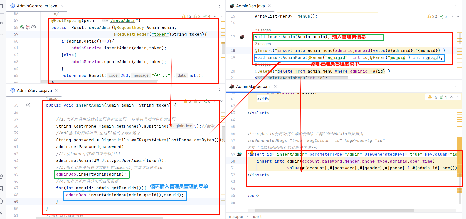 3.保存管理员信息到数据库的admin表,并拿到管理员id