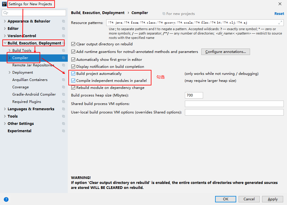 在 IDEA 当中自动编译默认是关闭状态,需要手动打开,注意设置界面是:File > Other Settings > Preferences for New: