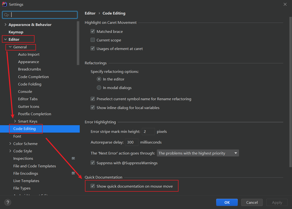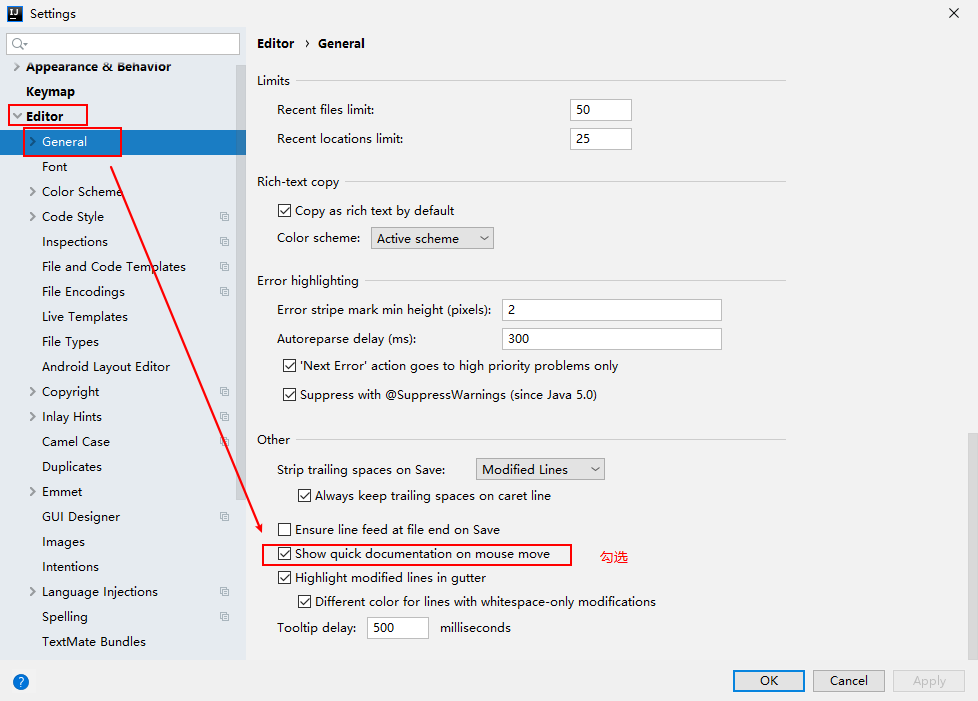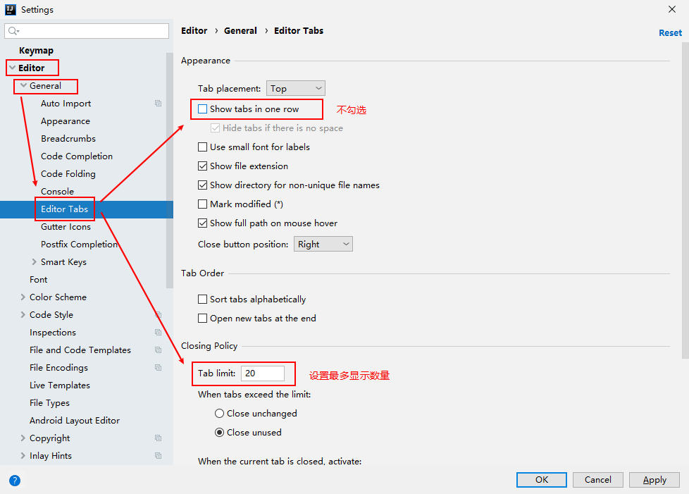 当我们打开的标签页多了的时候,默认的会隐藏在右侧,当我们需要的时候在右侧找到后再打开。IDEA 是支持多行显示的,这样在大屏幕的显示器上也不用总去点击右侧的去找刚才打开过的文件了(其实通过 Ctril + E 也可以找到刚才打开过的文件)。具体开关位置在:File > Settings > Editor > General > Editor Tabs: