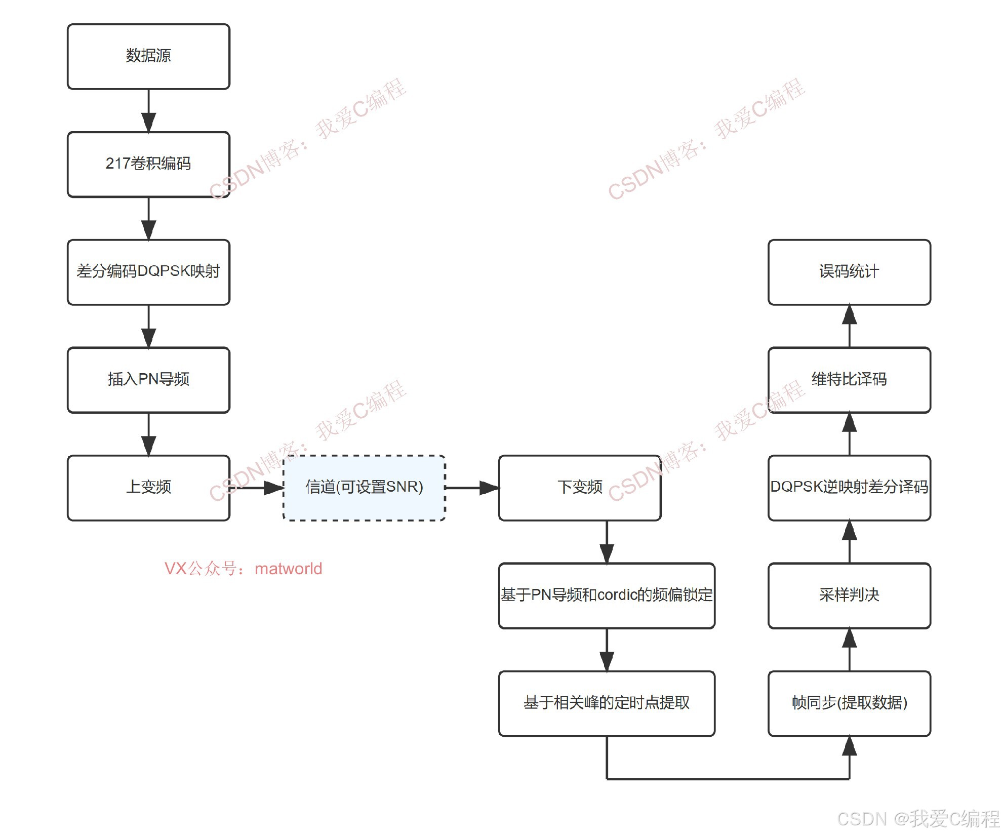 【仿真测试】基于FPGA的完整DQPSK通信链路实现,含频偏锁定,帧同步,定时点,Viterbi译码,信道,误码统计