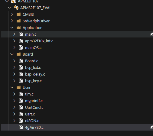 我建了一个user文件夹,user文件夹下有driver和app2个文件夹,但因为keil不能再细分,所以这里只能看到User,我将串口这些底层处理的放在driver,4g部分放在app