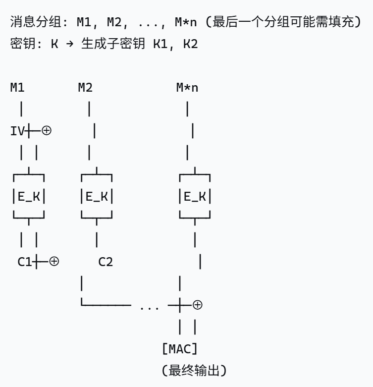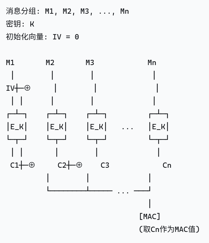 原理:使用密文分组链接模式(CBC),但只取最后一个密文分组作为MAC值。