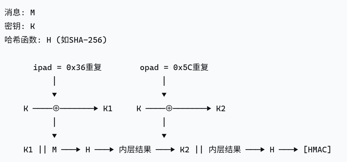 原理:使用密钥与哈希函数(如SHA-256、SM3)组合,通过两次哈希运算生成MAC。