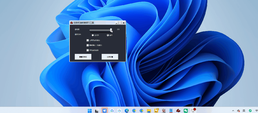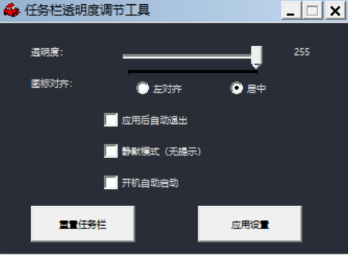 软件介绍 任务透明度调节可以通过PowerToys和TranslucentTB等等来实现,不过如果你只要任务栏透明度调节的功能,那么安一款PowerToys有点大材小用了。 软件使用 这时我们可以用今天的这款小工具,其大小仅88K,非常非常小。 软件就两个功能,一个是透明度,一个是图标对齐的功能,自己调节后点【应用设置】即可。 软件小巧、功能也简单,挺不错的! 软件下载 夸克 迅雷