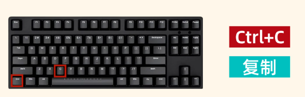 (2)第二步:复制 ——Ctrl+C按住键盘左下角的 Ctrl 键 不松手,再按一下字母 C 键(C=Copy,复制的英文),松开按键即完成 “复制”(此时内容已存在电脑 “剪贴板” 里,看不到但已保存)。