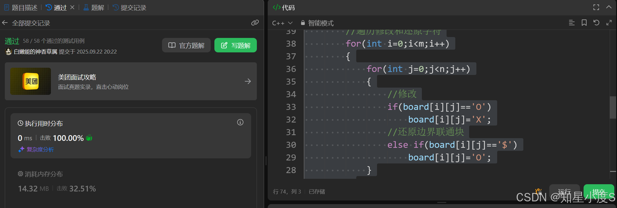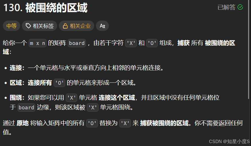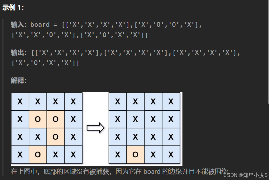 public:void solve(vector<vector<char>>& board){m = board.size();n = board[0].size();//处理边界联通块!!!//边界'O'更换为字符$for (int i = 0; i < m; i++){if (board[i][0] == 'O')bfs(board, i, 0);if (board[i][n - 1] == 'O')bfs(board, i, n - 1);}for (int i = 0; i < n; i++){if (board[0][i] == 'O')bfs(board, 0, i);if (board[m - 1][i] == 'O')bfs(board, m - 1, i);}//遍历修改和还原字符for (int i = 0; i < m; i++){for (int j = 0; j < n; j++){//修改if (board[i][j] == 'O')board[i][j] = 'X';//还原边界联通块else if (board[i][j] == '$')board[i][j] = 'O';}}}void bfs(vector<vector<char>>& board, int i, int j){queue<PII> q;q.push({ i,j });vis[i][j] = 1;board[i][j] = '$';while (q.size()){auto [qx, qy] = q.front();q.pop();for (int k = 0; k < 4; k++){int cx = qx + dx[k], cy = qy + dy[k];if (cx >= 0 && cx < m && cy >= 0 && cy < n && board[cx][cy] == 'O' && !vis[cx][cy]){q.push({ cx,cy });vis[cx][cy] = 1;board[cx][cy] = '$';//修改字符}}}}