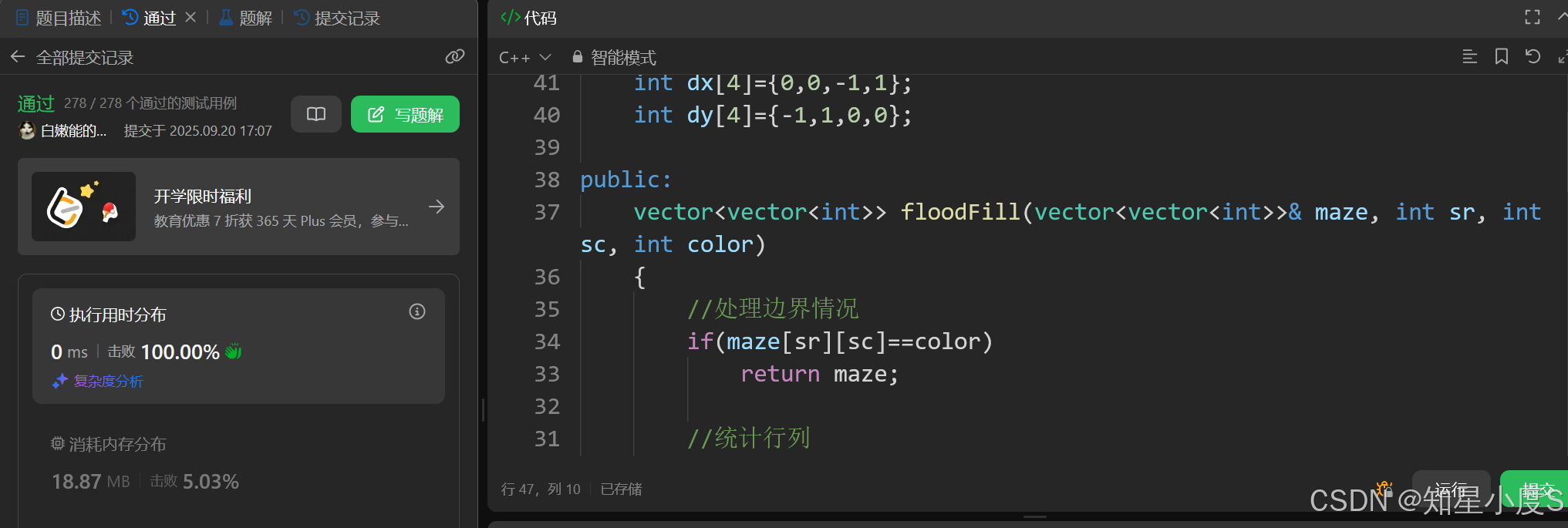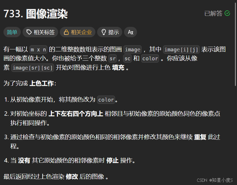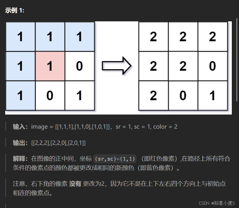 {typedef pair<int, int> PII;//类型更加简洁//两个数组对应四个方向int dx[4] = { 0,0,-1,1 };int dy[4] = { -1,1,0,0 };public:vector<vector<int>> floodFill(vector<vector<int>>& maze, int sr, int sc, int color){//处理边界情况if (maze[sr][sc] == color)return maze;//统计行列int m = maze.size();int n = maze[0].size();//记录原来的颜色int prev = maze[sr][sc];int vis[51][51] = { 0 };//记录位置是否被访问queue<PII> q;//队列保存//起点入队列q.push({ sr,sc });maze[sr][sc] = color;//修改颜色vis[sr][sc] = 1;//起点已经被访问while (q.size()){auto [qx, qy] = q.front();//取队头元素坐标q.pop();//对周围满足条件的进行上色for (int i = 0; i < 4; i++){int cx = qx + dx[i], cy = qy + dy[i];if (cx >= 0 && cx < m && cy >= 0 && cy < n && maze[cx][cy] == prev && !vis[cx][cy]){q.push({ cx,cy });//入队列maze[cx][cy] = color;//修改为需要的颜色vis[cx][cy] = 1;//标记为被访问}}}//返回修改后的结果return maze;}