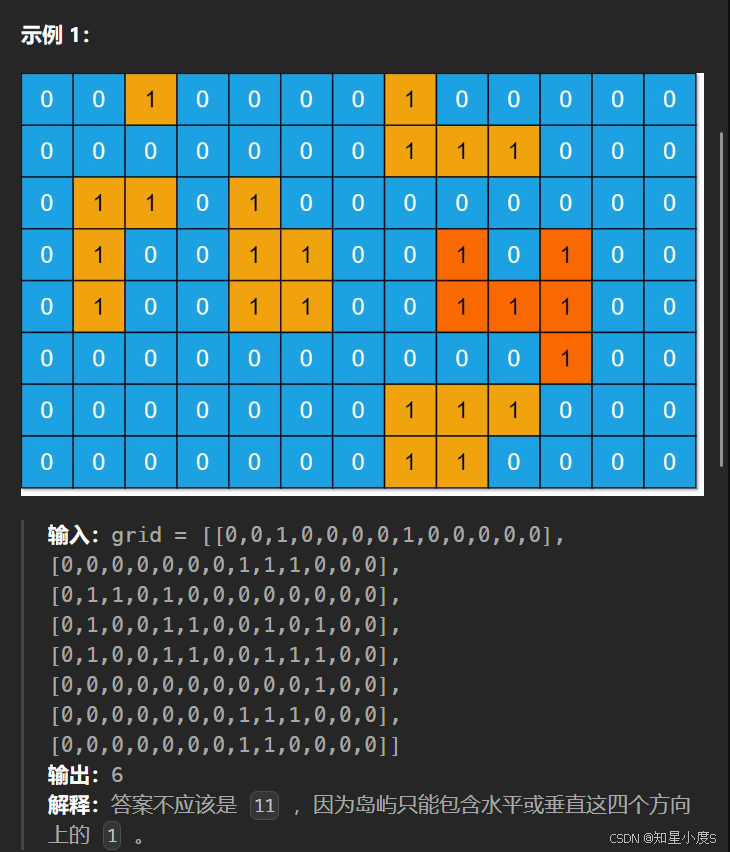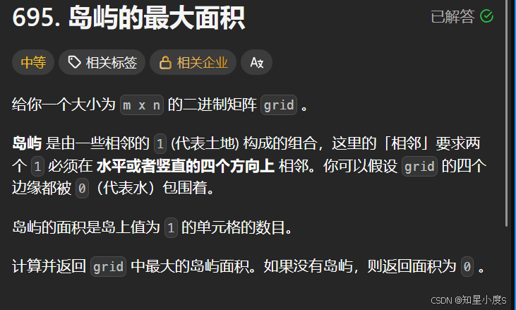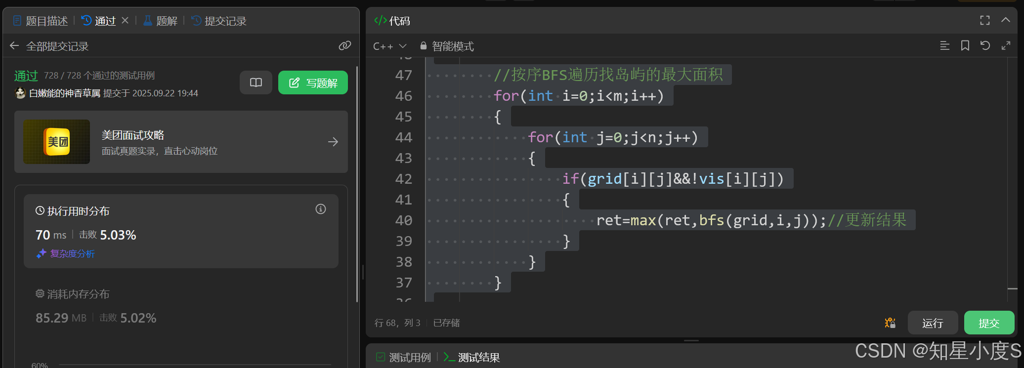public:int maxAreaOfIsland(vector<vector<int>>& grid){//统计行列m = grid.size();n = grid[0].size();//记录结果int ret = 0;//按序BFS遍历找岛屿的最大面积for (int i = 0; i < m; i++){for (int j = 0; j < n; j++){if (grid[i][j] && !vis[i][j]){ret = max(ret, bfs(grid, i, j));//更新结果}}}//返回结果return ret;}//使用bfs记录当前岛屿面积返回int bfs(vector<vector<int>> grid, int i, int j){int count = 0;//记录当前岛屿面积queue<PII> q;q.push({ i,j });vis[i][j] = 1;//当前位置记录被访问count++;//当前位置也算一个面积while (q.size()){auto [qx, qy] = q.front();q.pop();for (int k = 0; k < 4; k++){int cx = qx + dx[k], cy = qy + dy[k];if (cx >= 0 && cx < m && cy >= 0 && cy < n && grid[cx][cy] && !vis[cx][cy]){//是当前位置周围的陆地入队列,计数++q.push({ cx,cy });count++;vis[cx][cy] = 1;//记录被访问}}}cout << count << endl;return count;}};