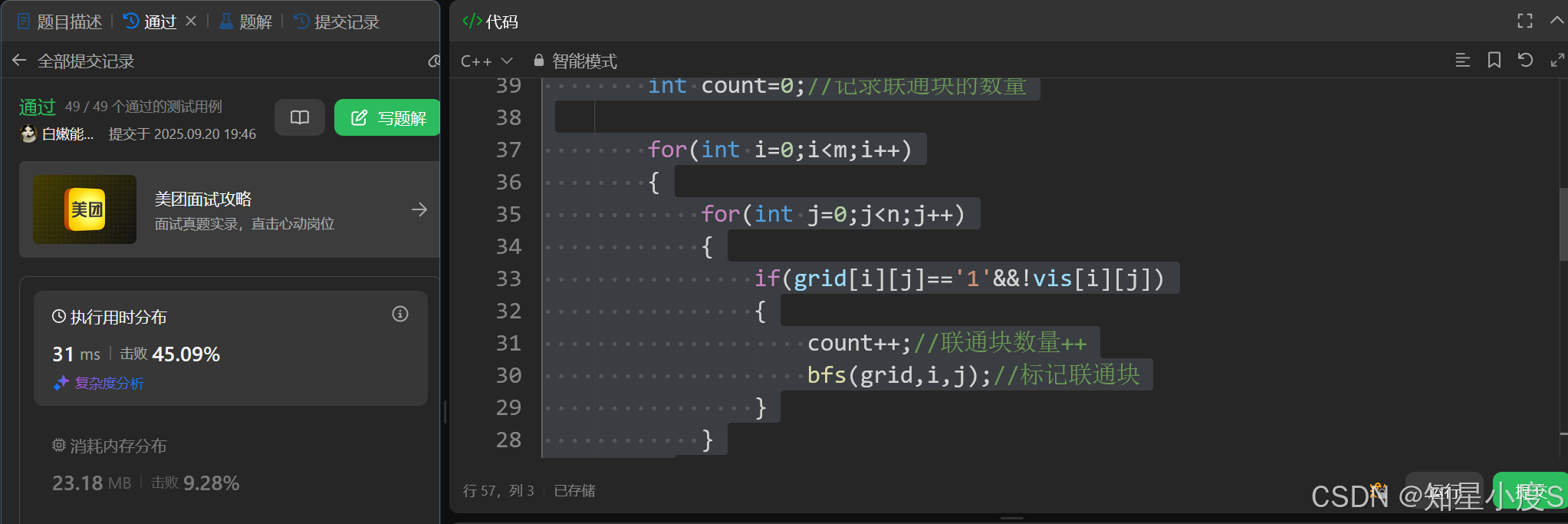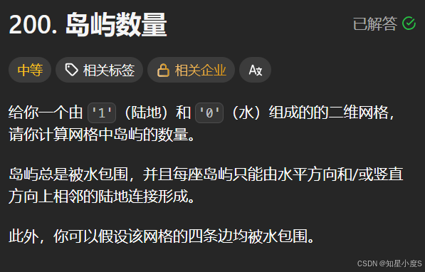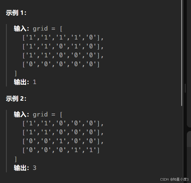 public:int numIslands(vector<vector<char>>& grid){m = grid.size();n = grid[0].size();int count = 0;//记录联通块的数量for (int i = 0; i < m; i++){for (int j = 0; j < n; j++){if (grid[i][j] == '1' && !vis[i][j]){count++;//联通块数量++bfs(grid, i, j);//标记联通块}}}return count;}void bfs(vector<vector<char>>& grid, int i, int j){queue<PII> q;q.push({ i,j });vis[i][j] = 1;while (q.size()){auto [qx, qy] = q.front();q.pop();for (int k = 0; k < 4; k++){int cx = qx + dx[k], cy = qy + dy[k];if (cx >= 0 && cx < m && cy >= 0 && cy < n && grid[cx][cy] == '1' && !vis[cx][cy]){q.push({ cx,cy });//是联通块内的入队列vis[cx][cy] = 1;//标记被访问}}}}