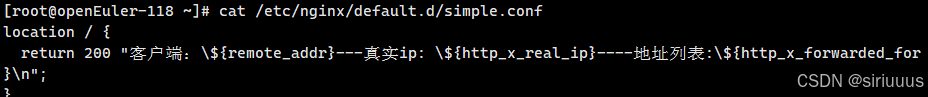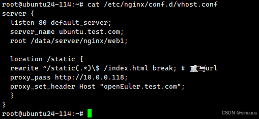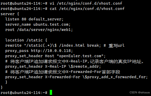 server {listen 80 default_server;server_name ubuntu.test.com;root /data/server/nginx/web1;location /static {rewrite ^/static(.*)\$ /index.html break; # 重写urlproxy_pass http://10.0.0.118;proxy_set_header Host "openEuler.test.com";# 将客户端IP追加请求报文中X-Real-IP,记录客户端的真实IP地址。proxy_set_header X-Real-IP \$remote_addr;# 将客户端IP追加请求报文中X-Forwarded-For首部字段proxy_set_header X-Forwarded-For \$proxy_add_x_forwarded_for;}