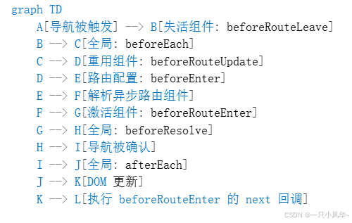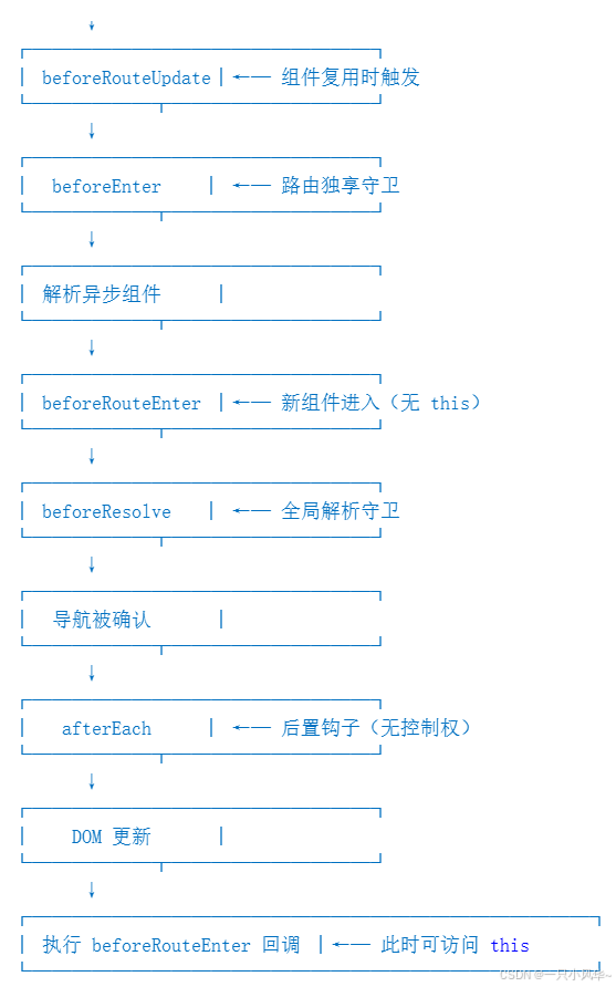 导航经历离开原组件 → 全局前置 → 路由独享 → 解析异步组件 → 进入新组件 → 最终确认 → DOM 更新 → 回调执行。