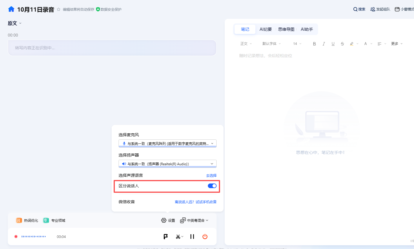 讯飞听见在基础转写功能上表现出色。它支持边录音边转写,也支持导入已有的音视频文件进行转写。实测中,它对中文专业术语的识别准确性处于行业领先水平,能够较好地处理学术访谈中常见的复杂句式。同时,它具备说话人区分功能,可以自动识别并标注不同的发言者。