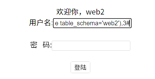 3.使用admin 'union select 1,database(),3#,查到这个数据库名为web2