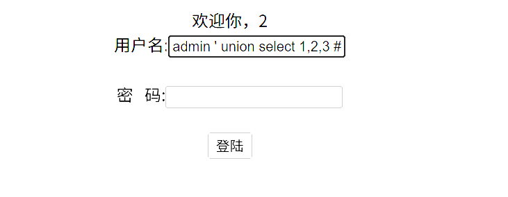 2.发现有回显后,证明存在SQL注入,使用联合注入进行查询数据库列数,这里直接跳过一行一行查询过程,直接使用admin' union select 1,2,3#,进行查询,发现爆出2库