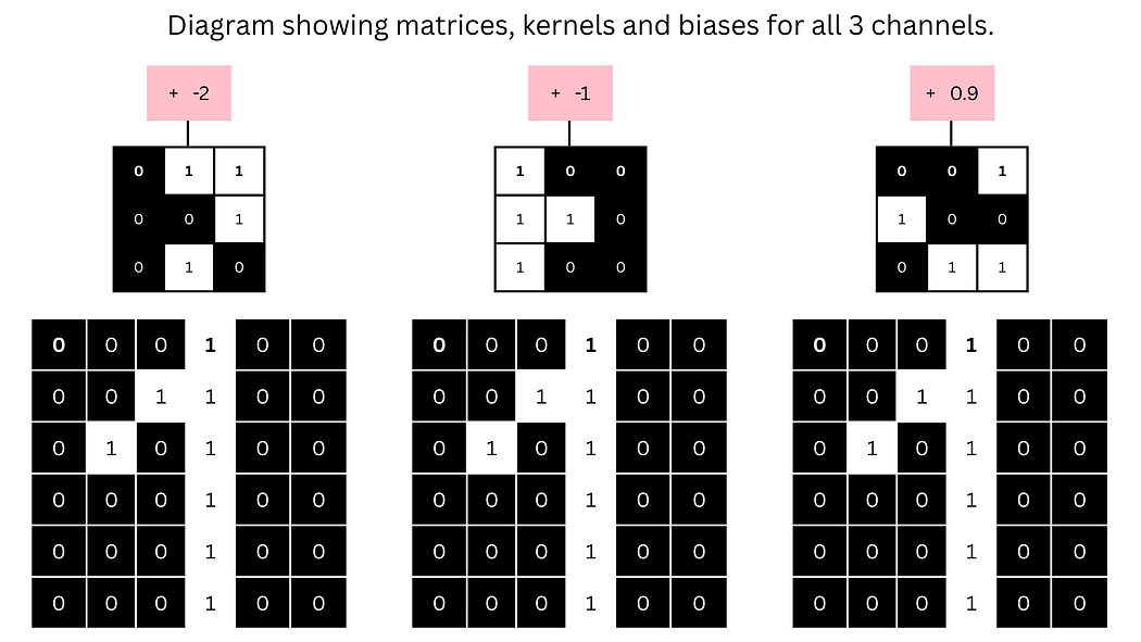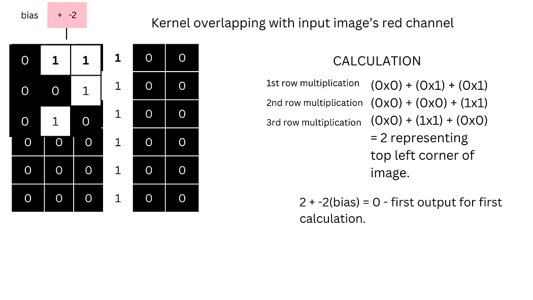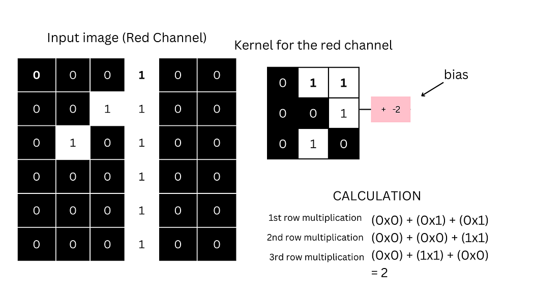 偏置项是可训练的参数,通过偏移激活值帮助模型更好地拟合数据。例如,红色通道卷积核的偏置项为-2,会与该通道首个输出值(2)相加。
