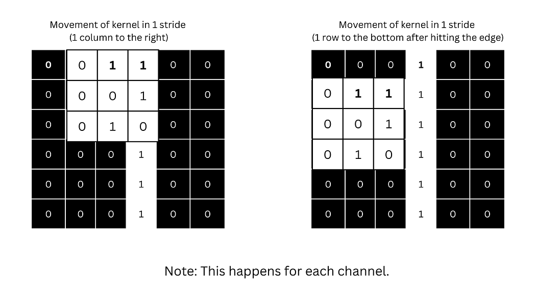 卷积核的移动距离称为步长。步长为1时,卷积核每次向右移动1列;步长为2时,每次移动2列。当卷积核到达图像边缘后,将按步长向下移动,重复计算过程。