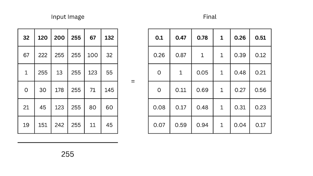首先对图像的三个通道执行预处理,将像素值除以255,使其落在0-1范围内。为简化说明,假设处理对象为黑白图像:255(白色)除以255得1,0(黑色)除以255得0。