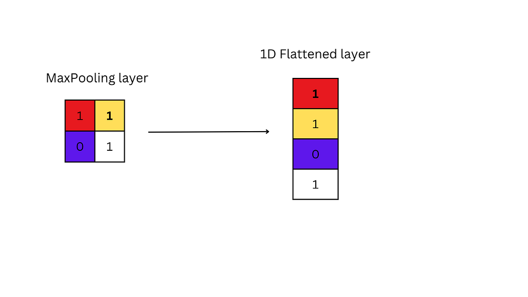 最大池化的输出为二维矩阵(如2×2),而前馈神经网络仅接受一维数组。因此,需将二维矩阵展平为一维数组。