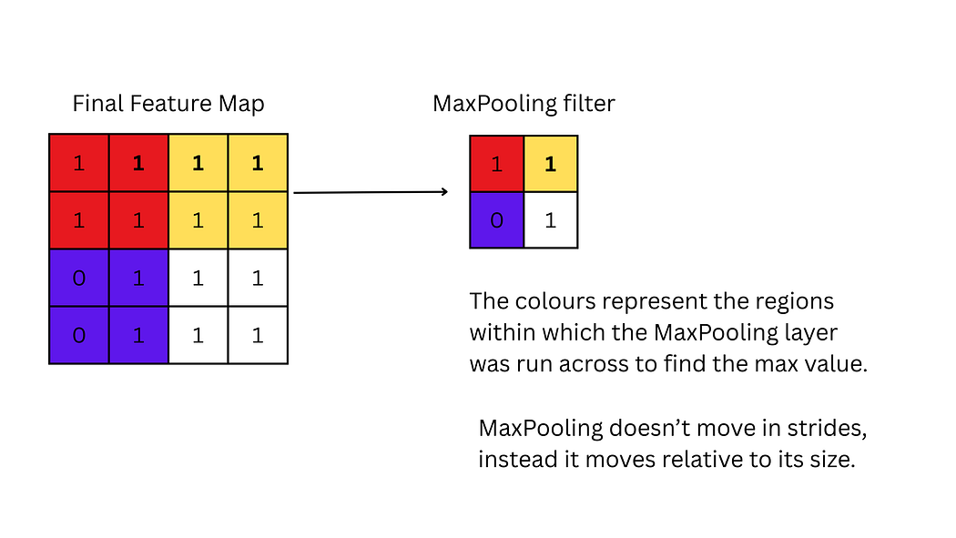以2×2最大池化层为例,其初始放置于4×4特征图的左上角,提取该2×2区域的最大值。池化层通常以自身尺寸为步长移动(也可自定义步长),即每次向右移动2列,到达边缘后向下移动2行,最终生成2×2矩阵。