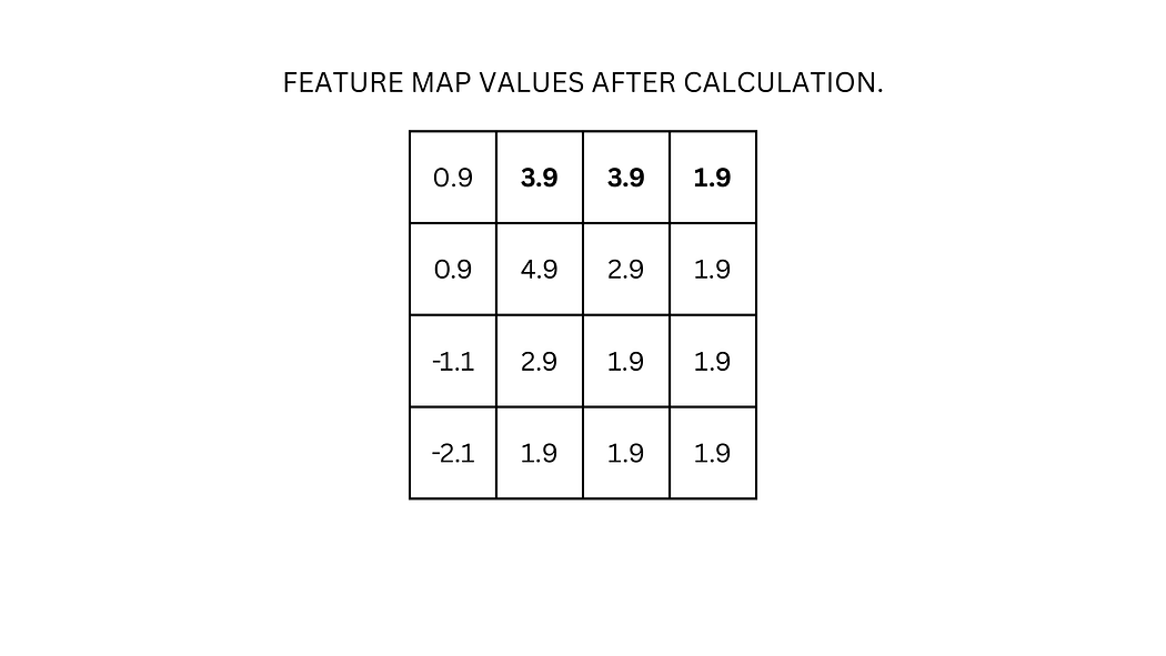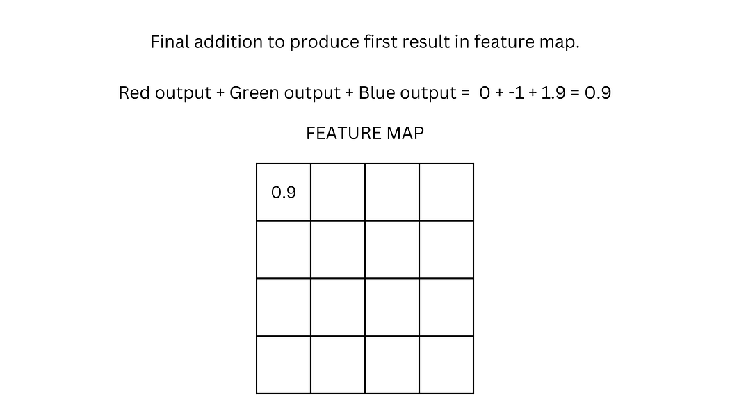 特征图为单一矩阵,需将各通道对应区域的输出值相加。上述三通道左上角区域的输出值之和为:(0 + (-1) + 1.9 = 0.9),该值作为特征图左上角的像素值。