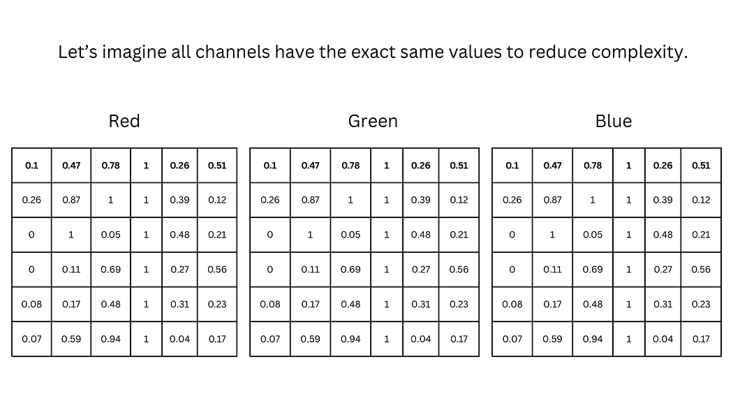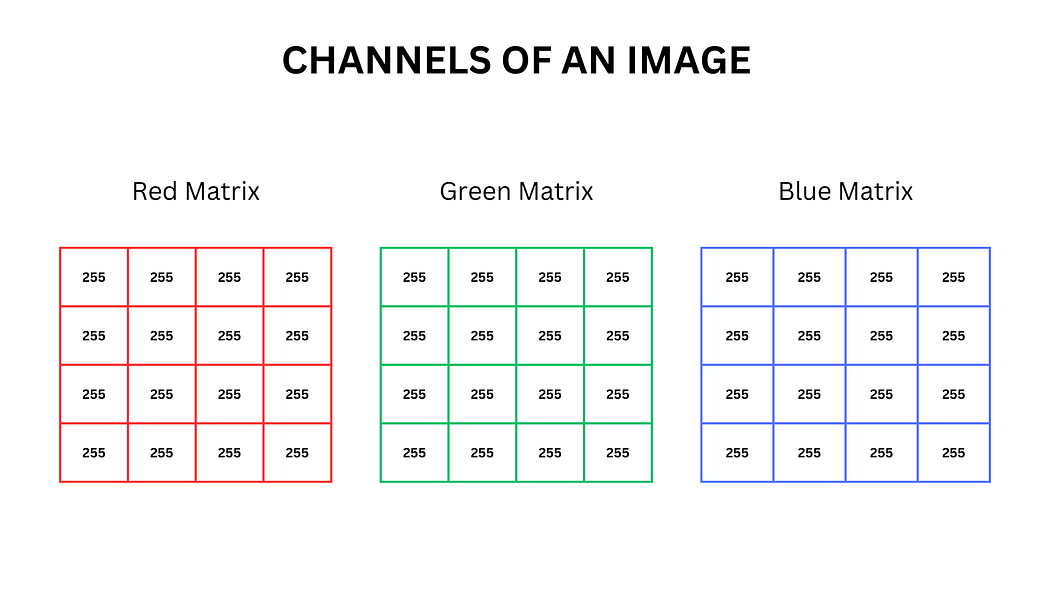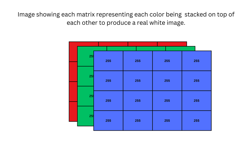 如前所述,图像由矩阵构成,像素(矩阵单元)的数值范围为0到255,其中0代表最低颜色强度(黑色),255代表最高颜色强度。每个彩色图像包含三个尺寸相同的矩阵,分别对应红色、绿色和蓝色通道,每个通道矩阵中单元格的数值(0-255)表示该颜色的强度。当三个矩阵中对应单元格的数值均为255时,图像呈现白色;均为0时,呈现黑色。