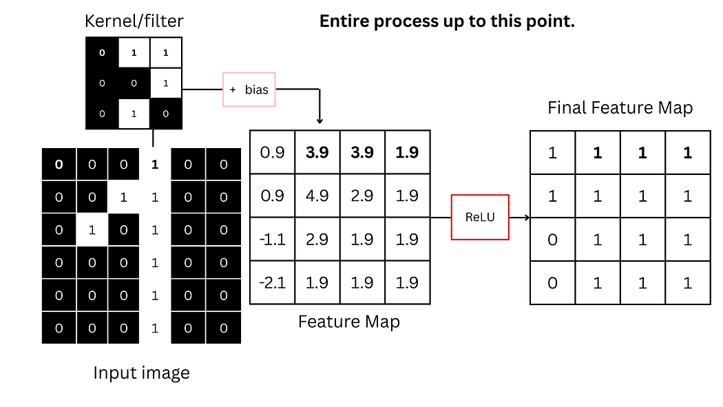 特征图生成后,需通过ReLU激活函数处理:将所有负像素值转为0,保留正像素值。为简化说明,此处将所有正像素值转换为1(注:此步骤不属于卷积过程),最终得到仅含0和1的特征图。