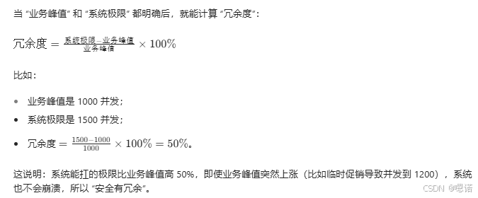 极限负载是 “系统刚好不崩溃的最大压力”,用于判断 “业务峰值是否有冗余”(比如峰值 1000 并发,极限是 1500,说明有 50% 冗余,安全)。峰值可以从业务场景和历史数据倒退,至于系统极限要通过压力测试阶梯加压测出,两者结合再判断