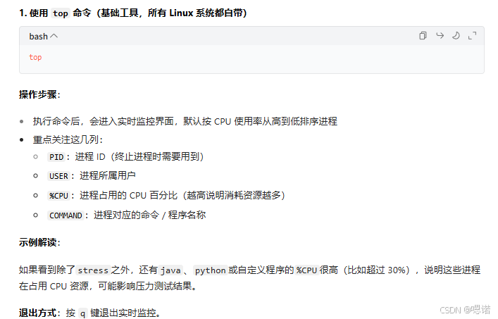- 案例 2:内存测试时,分配 3G 却持续增长到 5G→ 查日志发现 “stress 内存泄漏”→ 是 stress 版本 bug,升级版本后解决。