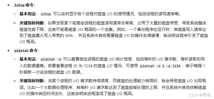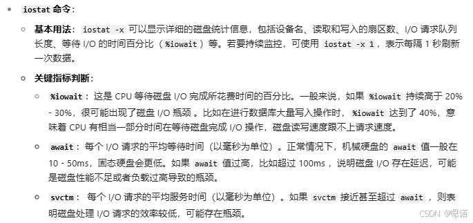 (IO 等待)超 20%(CPU 等着磁盘 / 网络,无法干活); - 内存:开始使用 Swap(