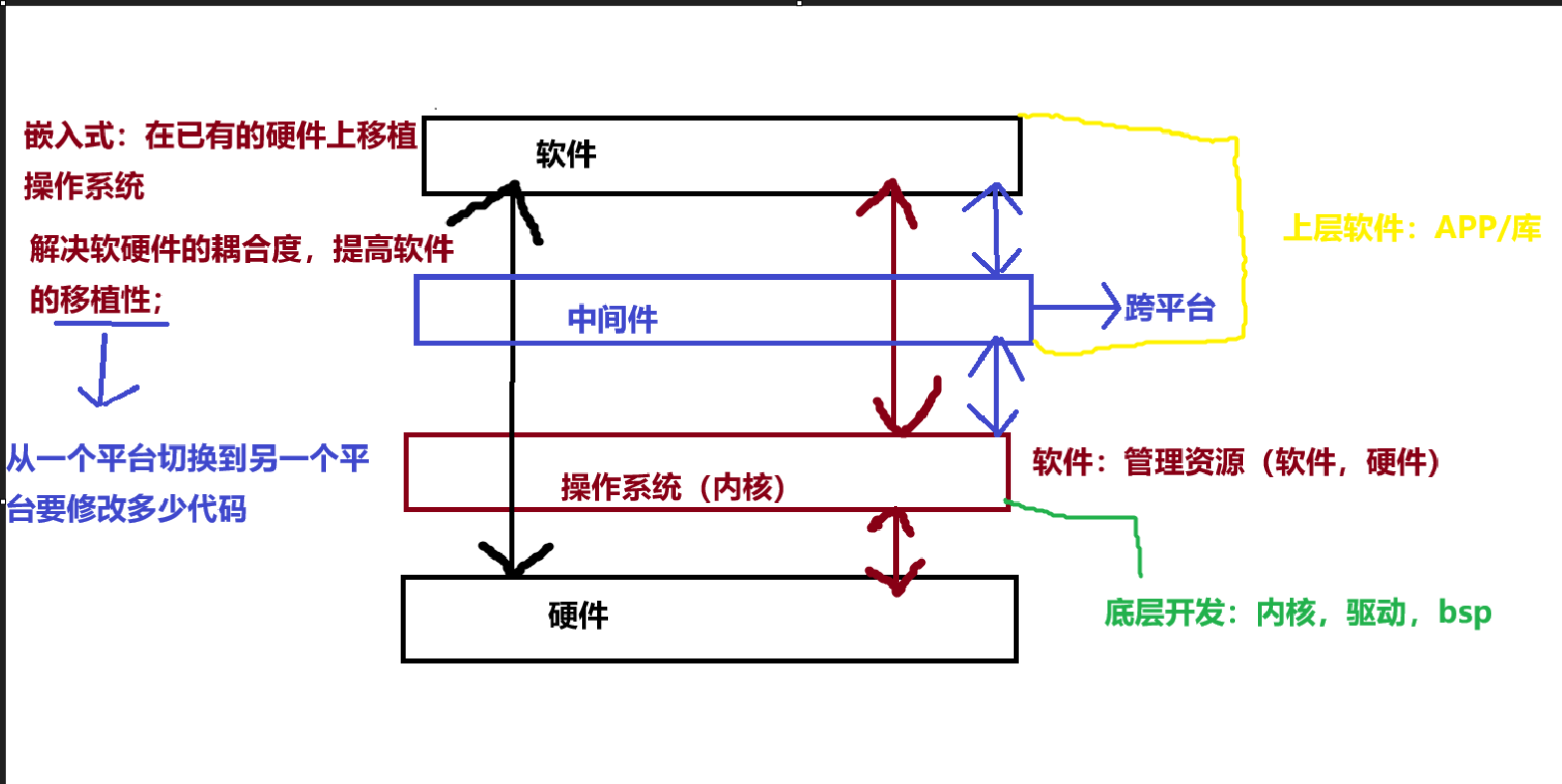 相较于传统开发模式中软件直接与硬件交互的模式,嵌入式开发则是在操作系统的基础上对硬件进行操作,因此相较于传统开发模式,嵌入式开发在一定程度上提高了软件的可移植性(从一个平台切换到另一个平台需要修改多少代码),操作在此过程中起到了调度硬件资源的作用。在现代嵌入式开发中位于操作系统和应用层软件之间还有中间件的存在,中间件的存在降低了开发难度并提升了系统的可移植性。例如在单片机开发中使用的HAL库就是中间件的代表,其通过提供统一的接口(例如GPIO,I2C等)封装硬件操作,使开发者无需了解底层硬件即可进行开发