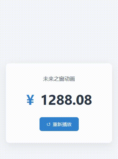 <body><div class="amount-container"><div class="title">汇总金额</div><div class="amount-display"><span class="currency">¥</span><span id="amountValue">0.00</span></div><button id="replayBtn" class="control-btn"><span>↺</span><span>重新播放</span></button></div><script>/*** 平滑数字滚动动画函数* @param {string} elementId - 显示金额的元素ID* @param {number} targetValue - 目标金额* @param {number} duration - 动画持续时间(毫秒)* @param {number} decimalPlaces - 保留的小数位数*/function animateNumber(elementId, targetValue, duration = 5000, decimalPlaces = 2) {// 获取显示元素const element = document.getElementById(elementId);if (!element) {console.error('找不到指定的元素:', elementId);return;}let startTime = null;const startValue = 0;// 缓动函数 - 使动画先快后慢,接近目标时减速function easeOutQuart(t) {return 1 - Math.pow(1 - t, 4);}// 动画更新函数function updateNumber(timestamp) {if (!startTime) startTime = timestamp;// 计算动画进度(0到1之间)const progress = Math.min((timestamp - startTime) / duration, 1);// 应用缓动效果const easedProgress = easeOutQuart(progress);// 计算当前值const currentValue = startValue + (targetValue - startValue) * easedProgress;// 格式化并显示当前值element.textContent = currentValue.toFixed(decimalPlaces);// 动画未完成则继续if (progress < 1) {requestAnimationFrame(updateNumber);}}// 开始动画requestAnimationFrame(updateNumber);}// 初始化document.addEventListener('DOMContentLoaded', () => {const targetAmount = 1288.08; // 目标汇总金额// 首次加载时运行动画animateNumber('amountValue', targetAmount, 5000);// 重新播放按钮事件document.getElementById('replayBtn').addEventListener('click', () => {// 重置显示为0document.getElementById('amountValue').textContent = '0.00';// 短暂延迟后重新开始动画,让重置效果可见setTimeout(() => {animateNumber('amountValue', targetAmount, 5000);}, 300);});});</script>