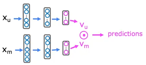 综上,我们需要将原始的特征信息输入神经网络进行处理。由于此时的推荐只依赖于用户与电影的特征信息,我们可以将预测评分表示为: